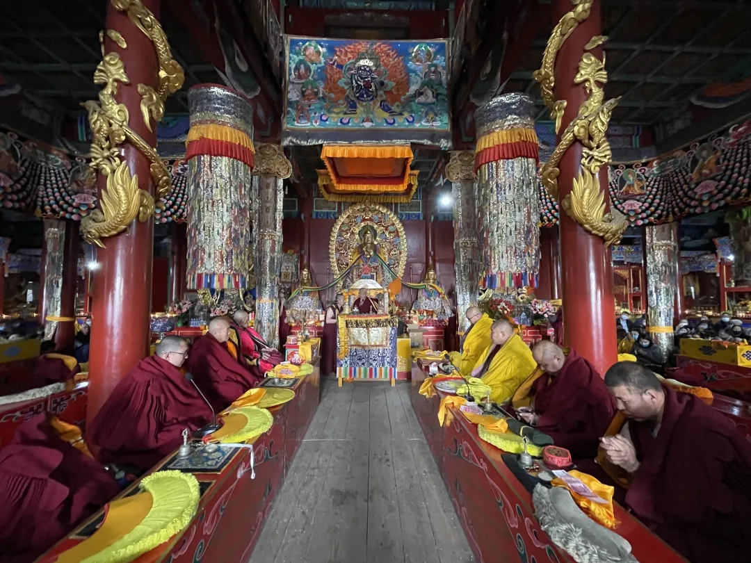 5月21日,藏历萨嘎月初十,旦却坚赞会长带领市佛协和锡盟佛协共21所寺院的僧众、居士百余名弟子在康宁寺迎接恩师莅临,并在大雄宝殿举行上师供养六光白度母长久驻世法五方天女祝寿仪轨。
